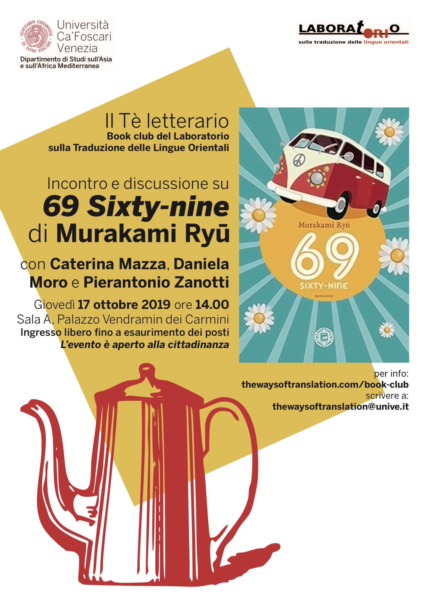 Il prossimo incontro del Tè letterario, dedicato a 69 Sixty-nine di Murakami Ryū (Trad. di Gianluca Coci, Atmosphere Libri), si terrà il 17 ottobre alle ore 14.00 presso la Sala A del Dipartimento.