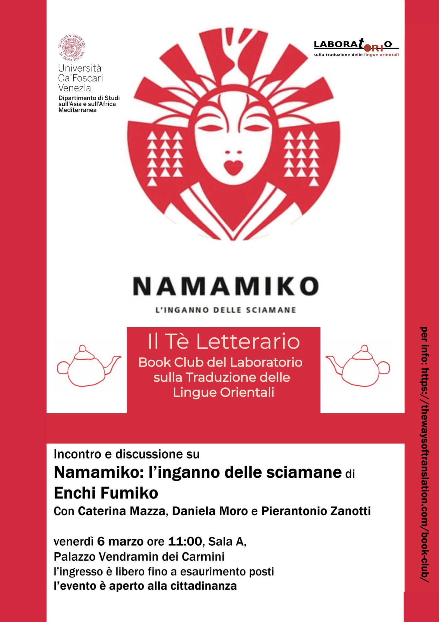 Il sesto incontro del Tè Letterario sarà dedicato a Namamiko. L’inganno delle sciamane di Enchi Fumiko (trad. di Paola Scrolavezza, Safarà Editore, 2019) e si terrà venerdì 6 marzo dalle ore 11.00 presso la Sala A del Dipartimento. Parteciperanno Caterina Mazza, Daniela Moro e Pierantonio Zanotti.