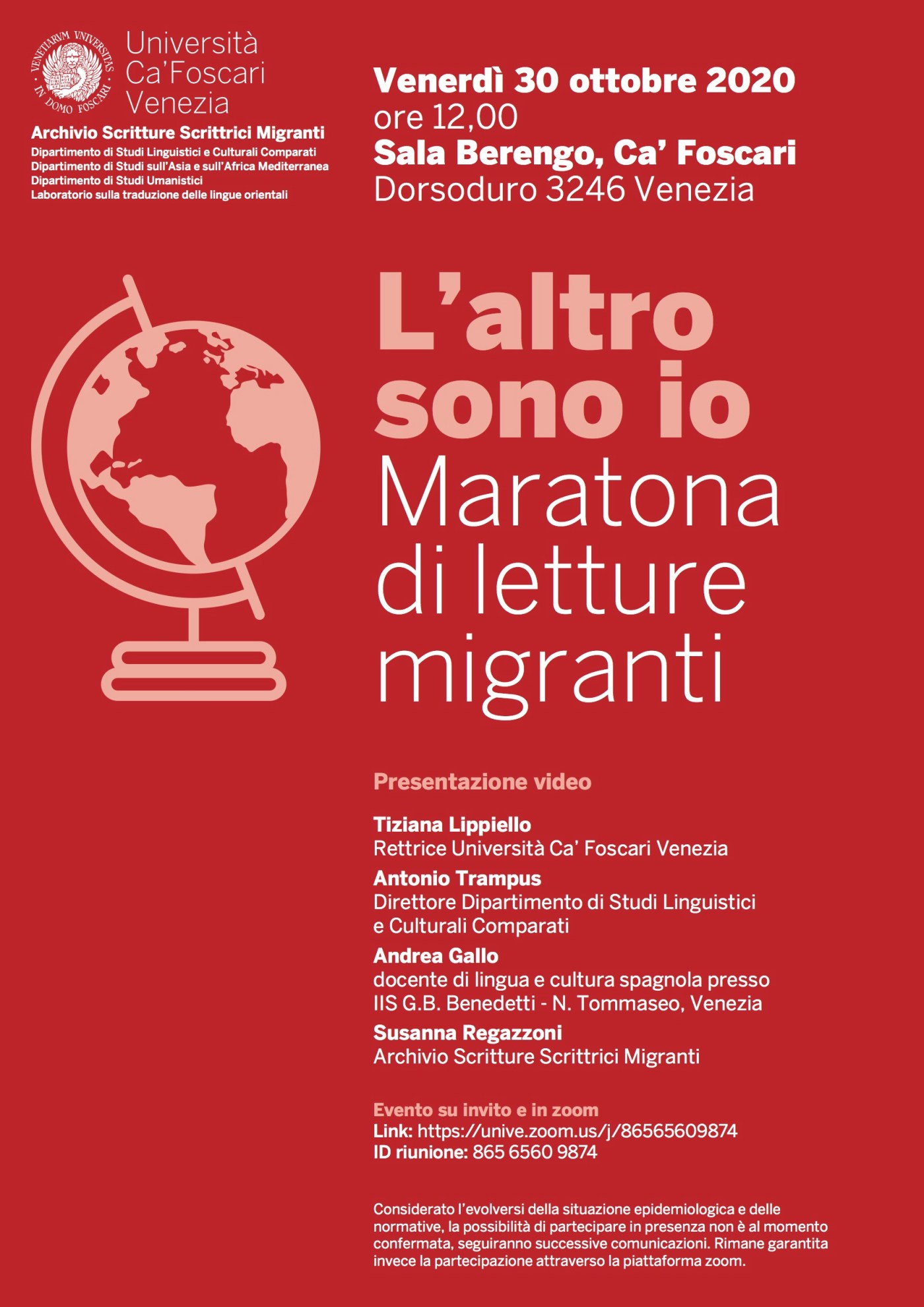 Domani 30 ottobre alle ore 12:00 in Sala Berengo verrà presentato un video per l’ormai consueta iniziativa, guidata dall’Archivio Scritture Scrittrici Migranti: L’altro sono io, quest’anno sotto forma di video, offre la lettura di testi di autrici e autori migranti in varie lingue a cura delle studentesse e degli studenti del nostro Ateneo e delle scuole veneziane. Una testimonianza sul potere delle parole e della traduzione.