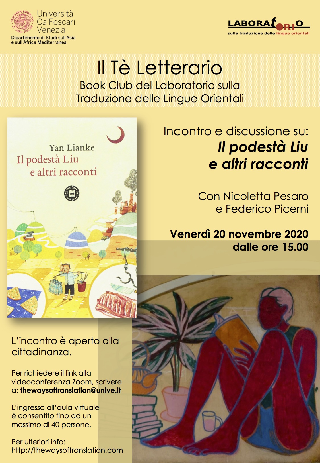 Il settimo incontro del Tè letterario si terrà venerdì 20 novembre dalle ore 15:00 in videoconferenza su Zoom. Il libro scelto dai lettori tramite il sondaggio pubblicato dal Laboratorio è: Yan Lianke, Il podestà Liu e altri racconti (trad. di Marco Fumian, Atmosphere libri, 2017). Durante l’incontro verrà comunicata la recensione vincitrice di Namamiko. L’inganno delle sciamane di Enchi Fumiko.