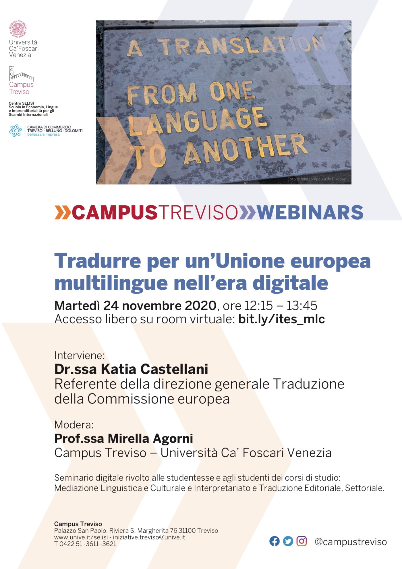 Si segnala il seminario digitale Tradurre per un’Unione europea multilingue nell’era digitale a cura di Dr. Katia Castellani Referente della direzione generale Traduzione della Commissione europea, rivolto alle studentesse e agli studenti dei corsi di studio: CdL in Mediazione Linguistica e Culturale CdLM in Interpretariato e Traduzione Editoriale, Settoriale, che si terrà martedì 24 novembre ore 12:15