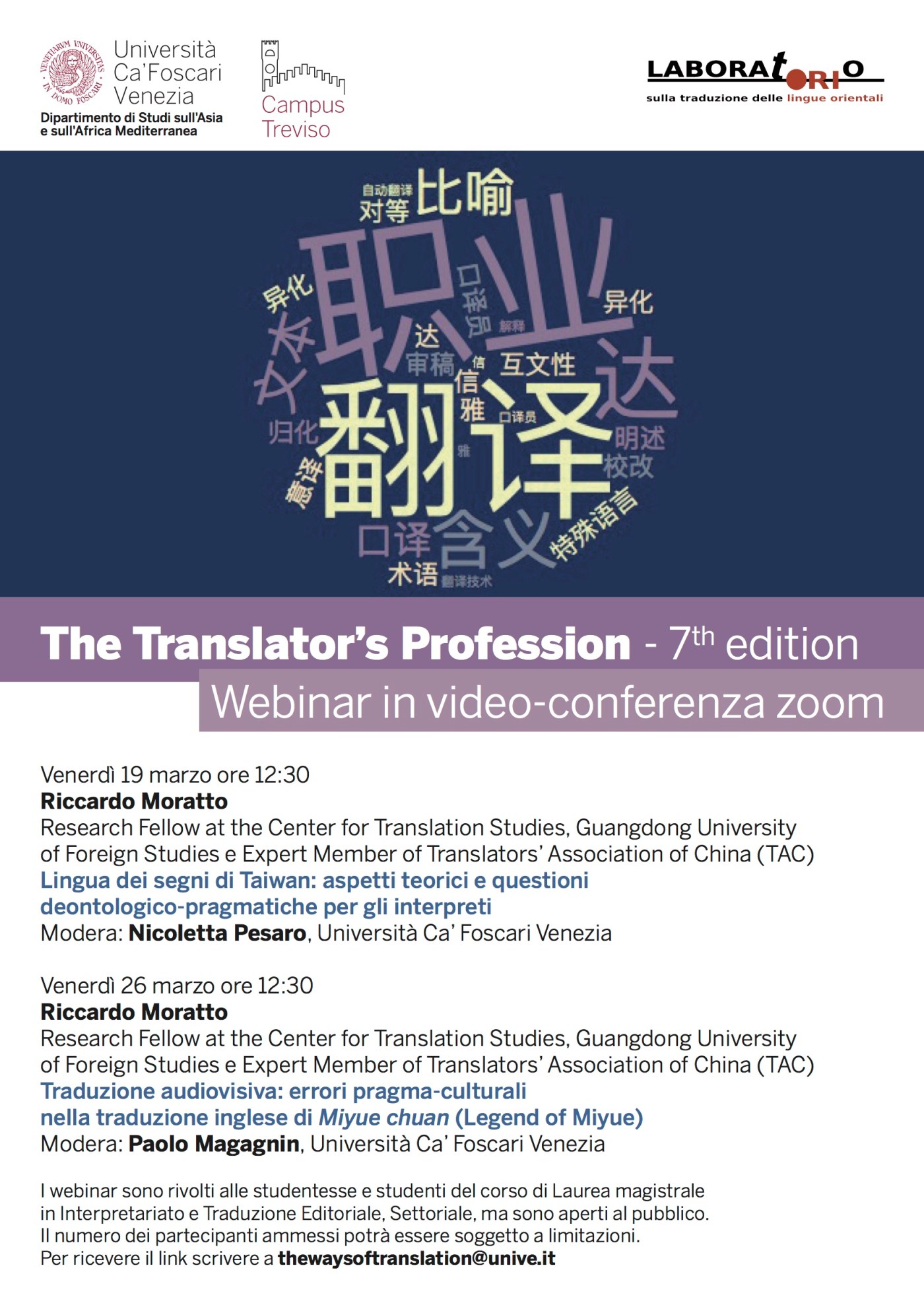 Per ricevere il link su zoom scrivere a Thewaysoftranslation@unive.it.