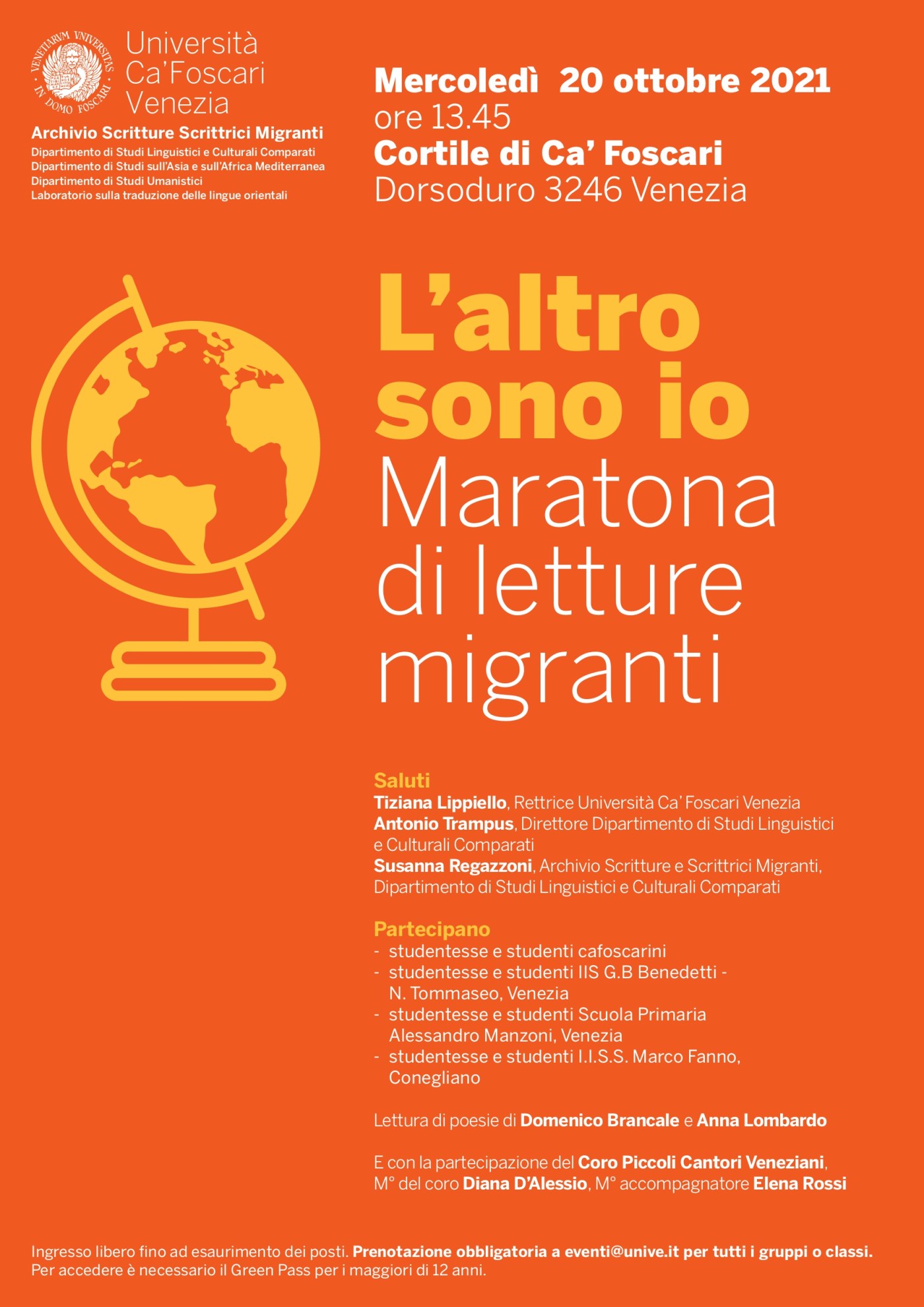 Siamo lieti di segnalare la nuova edizione della Maratona di letture migranti L’altro sono io che si terrà mercoledì 20 ottobre dalle ore 13:45 nel cortile di Ca’ Foscari.