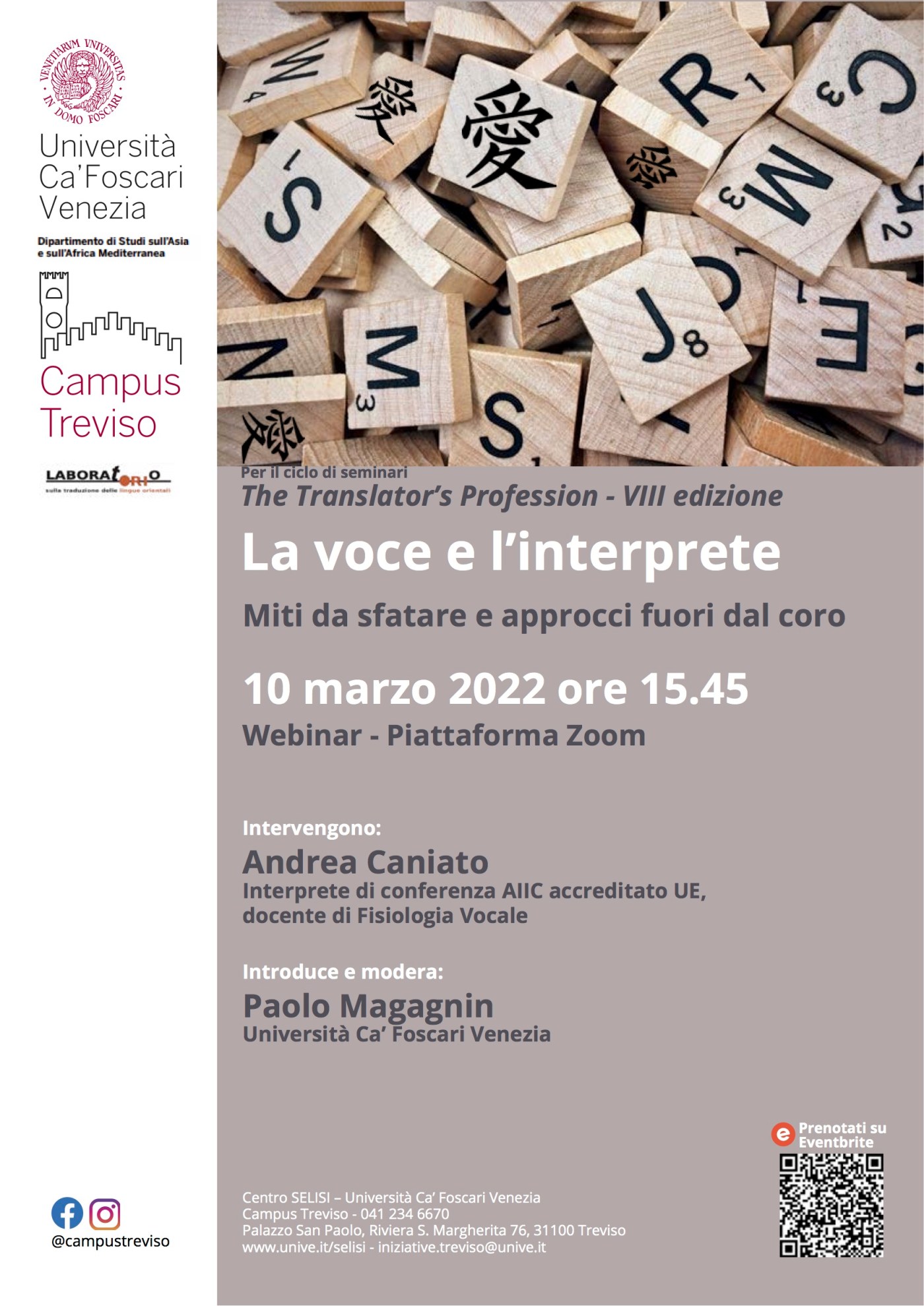 Il prossimo incontro del ciclo di conferenze dei professionisti e professioniste della traduzione e dell’interpretazione è il seminario online con Andrea Caniato (interprete AIIC accreditato UE e docente di fisiologia vocale applicata): “La voce e l’interprete. Miti da sfatare e approcci fuori dal coro”.