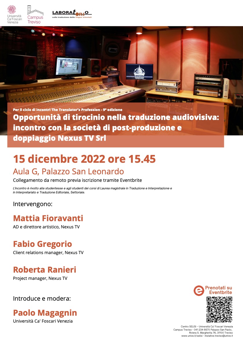 L’incontro è rivolto alle studentesse e agli studenti dei corsi di Laurea magistrale in Traduzione e Interpretazione e in Interpretariato e Traduzione Editoriale, Settoriale.