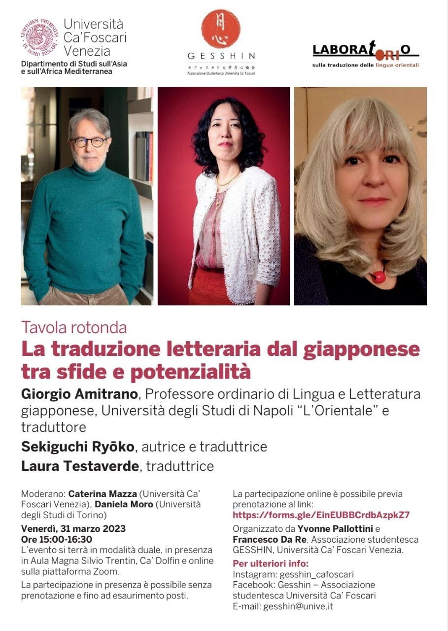 Nell’ambito delle ricche attività del LaboraTOrio con le scrittrici ospiti al festival Incroci di Civiltà, venerdì 31 marzo dalle 15:00, in Aula Magna Silvio Trentin a Ca’ Dolfin, si svolgerà una tavola rotonda sulla traduzione letteraria dal giapponese. Moderata da Caterina Mazza (Ca’ Foscari) e Daniela Moro (Università di Torino), la tavola rotonda vedrà la partecipazione della scrittrice Ryōko Sekiguchi e dei traduttori Giorgio Amitrano (L’Orientale di Napoli) e Laura Testaverde.