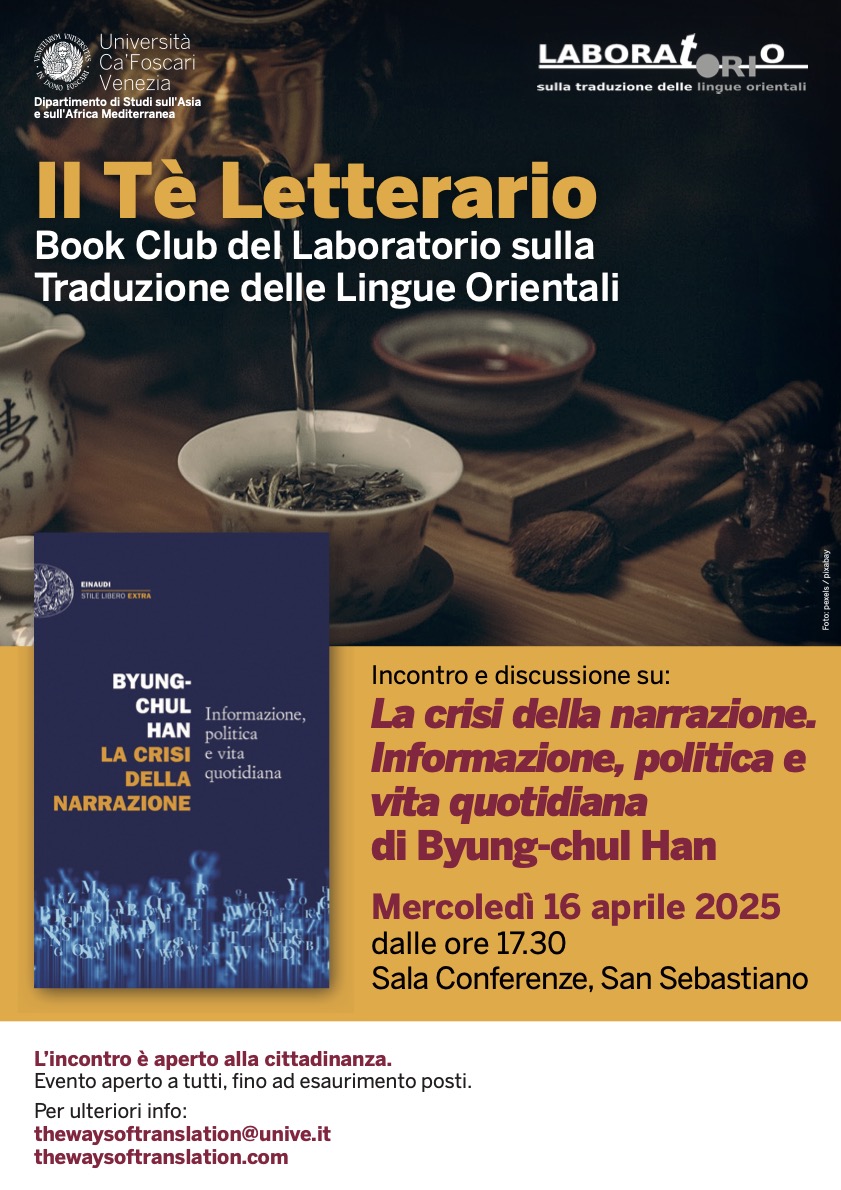 Il libro scelto per il prossimo appuntamento del Tè letterario è La crisi della narrazione. Informazione, politica e vita quotidiana di Byung-chul Han (trad. di A. Canzonieri, Einaudi 2024).