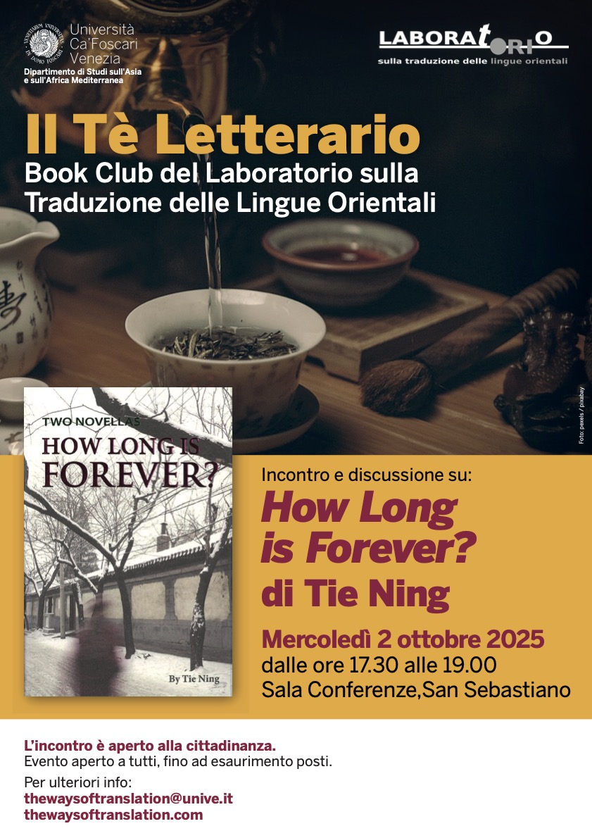 Giovedì 2 ottobre a partire dalle ore 17:30 in Sala Conferenze a San Sebastiano, torna il Tè letterario organizzato da studenti e studentesse del Dipartimento di Studi sull’Asia e sull’Africa mediterranea, con How Long is Forever di Tie Ning. La partecipazione è libera fino a esaurimento dei posti. Per ogni evenienza restiamo a disposizione: contattaci a thewaysoftranslation@unive.it
