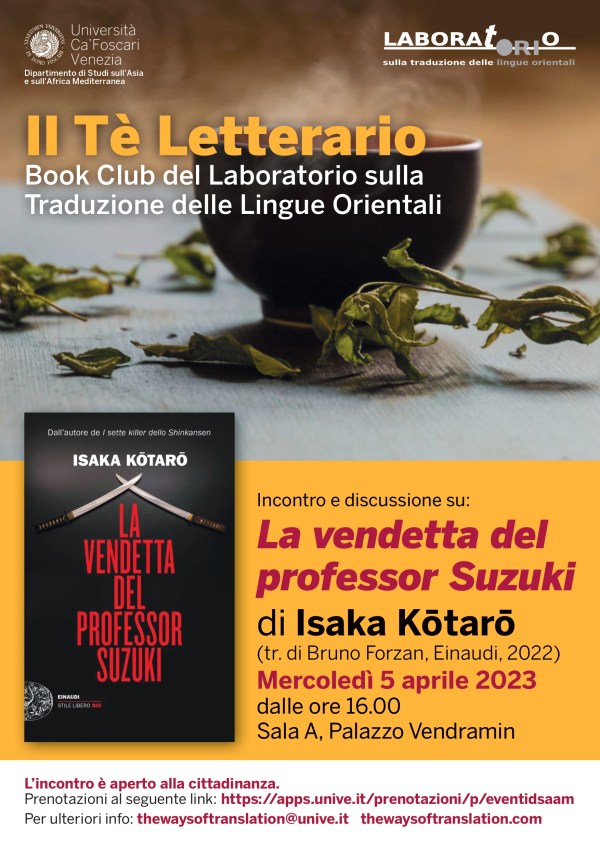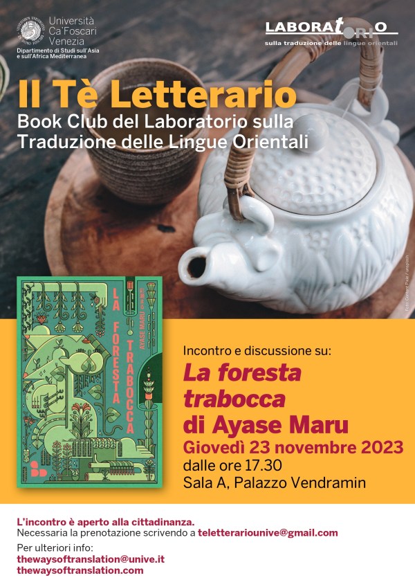 Il Tè letterario è il club del libro del Laboratorio sulla traduzione delle lingue orientali di Ca’ Foscari. Si rivolge ad appassionate e appassionati che hanno voglia di leggere letterature asiatiche in un ambiente leggero e tranquillo, oltre a lezioni ed esami. Non è una classe o una lezione ma un incontro alla pari. Non sono necessarie conoscenze pregresse sugli autori e sulle letterature. Non serve aver letto per forza fino all’ultima pagina del libro per partecipare. È richiesta solamente voglia di stare insieme a parlare di libri… più la raccomandazione di portarsi tè e biscotti!